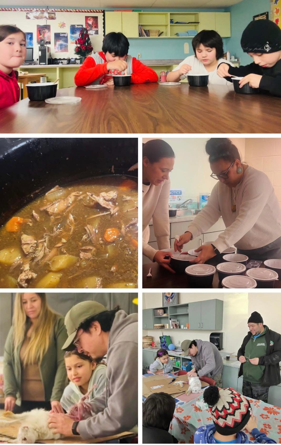 Back at the school, students gathered in the Healing and Wellness Room, where Tony led the skinning process, sharing traditional knowledge and techniques. Land Based Coordinator, Kate Jadis spoke about respecting the animal, using all parts, and giving thanks, while Jordan Marshall and Jan Marshall helped slow cook the rabbit and prepare stew.
